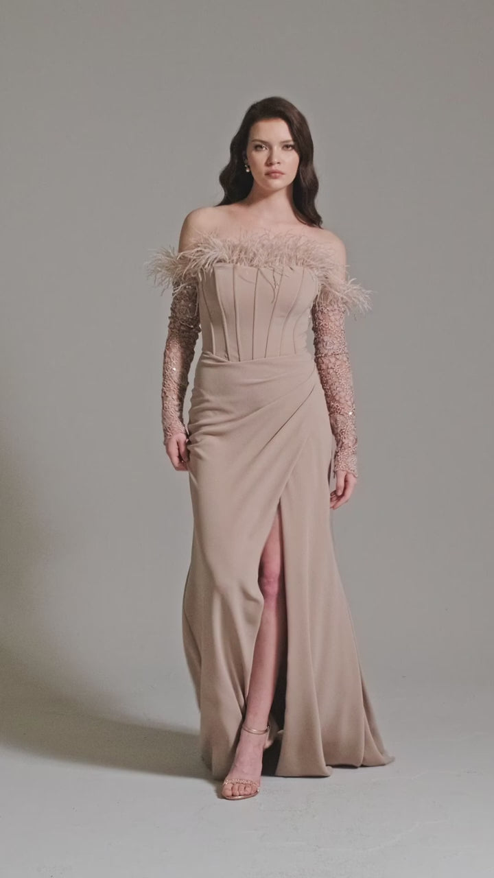Otriş detaylı yaka tasarımı ve transparan işlemeli kolları ile göz alıcı bir şıklık sunan bu balık model abiye, vücut hatlarını kusursuz şekilde sararak feminen bir siluet oluşturur.